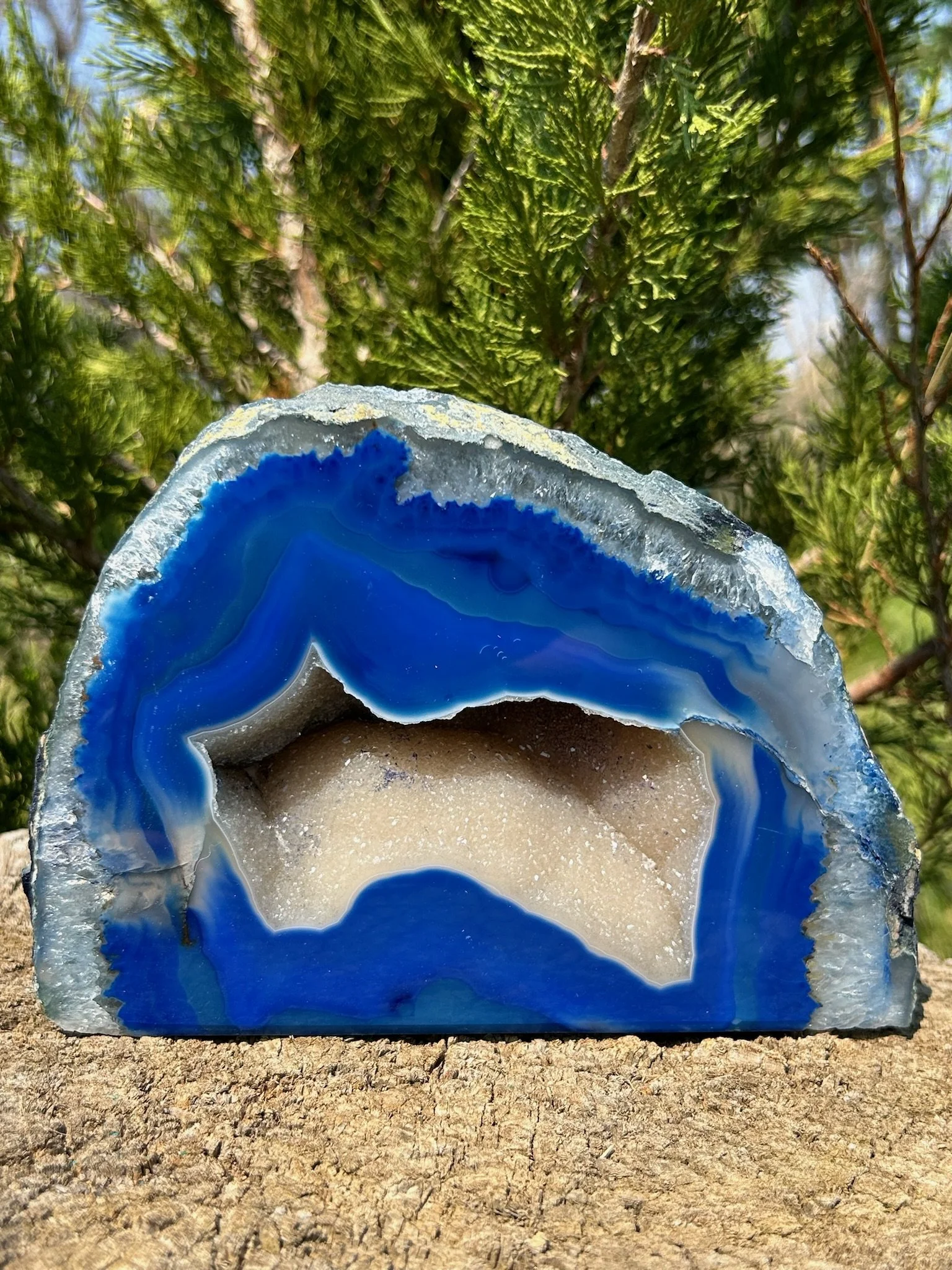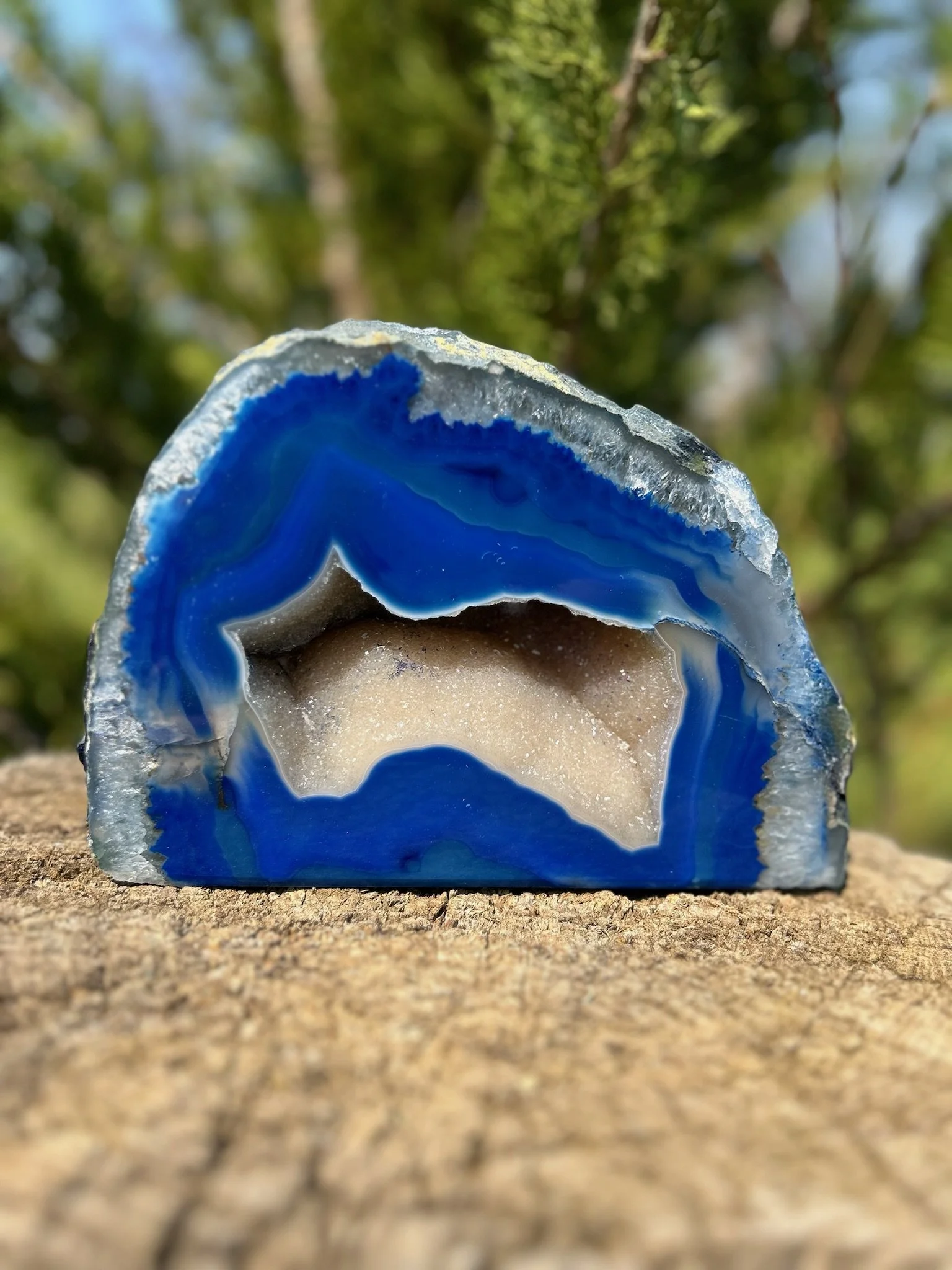 Dyed Druzy Agate Geode Price: $80Weight: 4 lbs 11.3 ozCleansing Method: Water + Smoke+ Music + IntentionFor inquiries or to purchase, contact us directly at RusticGBoutique@gmail.com Return Home